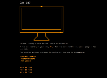 Trudge is a text-based, choice-driven narrative game aimed at people who have struggled with procrastination where you play as a solo game developer struggling to find the motivation to make a game. Balance your motivation with your finances and happiness as you make decisions that impact them while you develop your game.